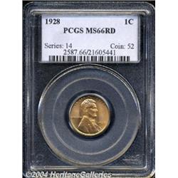 <B>1928<1C> MS66 Red PCGS.</B></I> A crisply struck orange-red premium Gem. The obverse is virtually carbon-free, while the reverse has no visible marks. <BR><BR><B>Important notice:</B> Heritage usually auctions material at the rate of 200-250 lots per hour. On some occasions eBay Live bid software or the Internet may not be able to keep up with the pace of the auction. We recommend placing a realistic absentee bid now as insurance to avoid disappointment. Occasionally the auctioneer may eliminate or reject an eBay Live bid, and the auctioneer may also reopen a lot after the close of the eBay live bidding (usually because we missed an audience bid), and may reject your bid even if it shows you as the winning bidder. By bidding via eBay Live, you agree that Heritage may award the lot to another bidder at its sole discretion under the circumstances described above or any other reasonable circumstances. Since eBay bids are not shown to us until we open the lot on the floor, we treat those bids just like floor bids. In most cases the floor responds before the eBay bid is presented to us, due to Internet lag time, so for consistency we have made it a policy that floor bids are always considered first over tie eBay live bids. Also please note that all Heritage lots purchased through eBay Live carry a 20% Buyer's Premium. Please make sure you read the Terms and Conditions before you bid. </span></font></tr></table></td></tr></table>