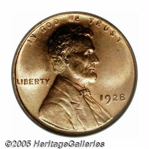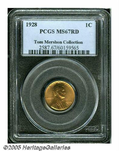 <B>1928<1C> MS67 Red PCGS.</B></I> Lovely honey-gold and crimson colors invigorate this sharply struck and highly lustrous Superb Gem. The surfaces are nearly free from contact, and the only hint of carbon are a couple of tiny flecks at the lower right portion of the reverse. Due to its Philadelphia Mint status, little attention was paid to the 1928 Cent until recent years, but its scarcity in high Mint State grades places it under strong demand from Registry Set collectors. Population: 48 in 67, 0 finer (3/05).<BR><I>From The Tom Mershon #2 All-Time PCGS Registry Set of Lincoln Wheat Cents.</B></I>
