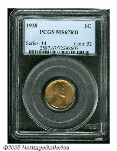 <B>1928<1C> MS67 Red PCGS.</B></I> Peach color fills the centers of this magnificent Superb Gem, while the margins offer hints of olive hues. Well struck and with potent luster. This virtually perfect Cent will fit splendidly into a competitive Registry Set. Population: 49 in 67, 0 finer (5/05).