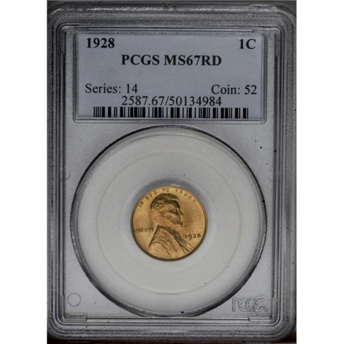 <B>1928<1C> MS67 Red PCGS.</B></I> Sharply struck with brilliant reddish-gold color. This gorgeous specimen is free from spotting or significant abrasions. Population: 51 in 67, none finer at either service (3/06).<BR><I>From The Kendall Marie #4 All-Time Finest PCGS Registry of Lincoln Cents with Varieties, Circulation Strikes, 1909-1958.</B></I> <BR><BR><B>Important notice:</B> Heritage usually auctions material at the rate of 200-250 lots per hour. On some occasions eBay Live bid software or the Internet may not be able to keep up with the pace of the auction. We recommend placing a realistic absentee bid now as insurance to avoid disappointment. Occasionally the auctioneer may eliminate or reject an eBay Live bid, and the auctioneer may also reopen a lot after the close of the eBay live bidding (usually because we missed an audience bid), and may reject your bid even if it shows you as the winning bidder. By bidding via eBay Live, you agree that Heritage may award the lot to another bidder at its sole discretion under the circumstances described above or any other reasonable circumstances. Since eBay bids are not shown to us until we open the lot on the floor, we treat those bids just like floor bids. In most cases the floor responds before the eBay bid is presented to us, due to Internet lag time, so for consistency we have made it a policy that floor bids are always considered first over tie eBay live bids. Also please note that all Heritage lots purchased through eBay Live carry a 20% Buyer's Premium. Please make sure you read the Terms and Conditions before you bid. This lot is being auctioned in conjunction with a live floor auction by Heritage Galleries & Auctioneers. All final auction and invoice information will be supplied by Heritage Galleries & Auctioneers, and all other information should be considered preliminary. Lot:521 <BR><BR><B>Winning Notification and Billing:</B> After the FINAL session in this auction is complete, Heritage will send e-mail and snail mail invoices. This process normally takes several days. All final auction and invoice information will be supplied by Heritage Galleries & Auctioneers, and all other information should be considered preliminary. <BR><BR>This auction will be conducted on a live auction floor and over the Internet through eBay Live. If you choose to place an absentee bid, please take a moment to <font color='#0000ff'><u><a href='http://pages.ebay.com/liveauctions/help/before/laabsentee.html'>learn how eBay Live absentee bidding works</a></u></font><font color='#000000'>