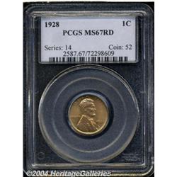 <B>1928<1C> MS67 Red PCGS.</B></I> A gorgeous orange-gold specimen that is particularly vibrant and as nice for the date as we have ever seen. PCGS agrees. Population: 22 in 67, none higher (7/04). <BR><BR><B>Important notice:</B> Heritage usually auctions material at the rate of 200-250 lots per hour. On some occasions eBay Live bid software or the Internet may not be able to keep up with the pace of the auction. We recommend placing a realistic absentee bid now as insurance to avoid disappointment. Occasionally the auctioneer may eliminate or reject an eBay Live bid, and the auctioneer may also reopen a lot after the close of the eBay live bidding (usually because we missed an audience bid), and may reject your bid even if it shows you as the winning bidder. By bidding via eBay Live, you agree that Heritage may award the lot to another bidder at its sole discretion under the circumstances described above or any other reasonable circumstances. Since eBay bids are not shown to us until we open the lot on the floor, we treat those bids just like floor bids. In most cases the floor responds before the eBay bid is presented to us, due to Internet lag time, so for consistency we have made it a policy that floor bids are always considered first over tie eBay live bids. Also please note that all Heritage lots purchased through eBay Live carry a 20% Buyer's Premium. Please make sure you read the Terms and Conditions before you bid. </span></font></tr></table></td></tr></table>