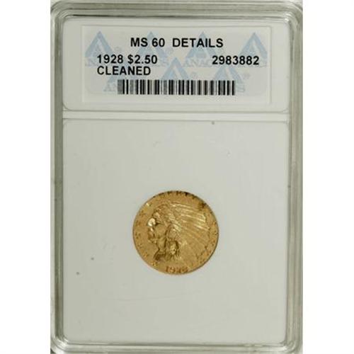 <B>1928 $2 1/2 --Cleaned--ANACS. MS60 Details.</B></I> NGC Census: (134/10248). PCGS Population (226/6735). Mintage: 416,000. Numismedia Wsl. Price for NGC/PCGS coin in MS60: $250. (#7952)<BR><BR><b>Shipping:</b> Coins & Currency (<a target="_blank" href="http://www.heritageauctions.com/common/shipping.php">view shipping information</a>)