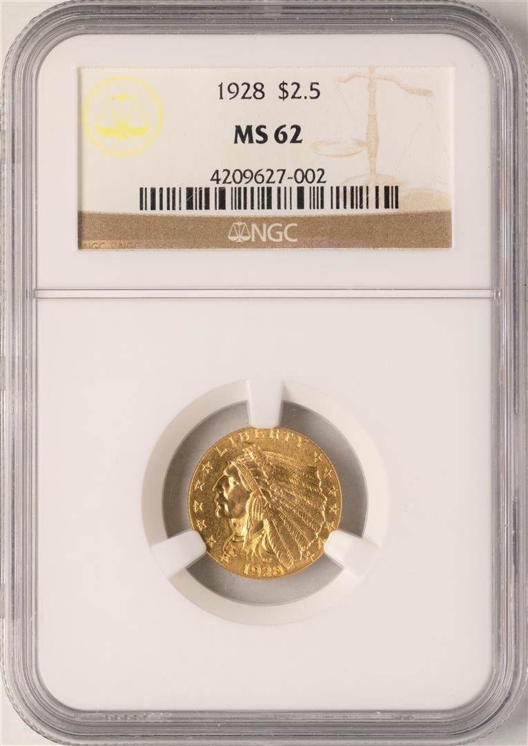 One 1928 $2 1/2 Indian Head Quarter Eagle Gold Coin NGC MS62. NGC Certified.