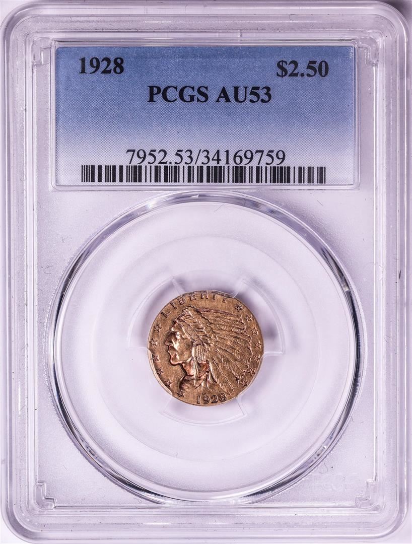 One 1928 $2 1/2 Indian Head Quarter Eagle Gold Coin PCGS AU53. PCGS Graded.