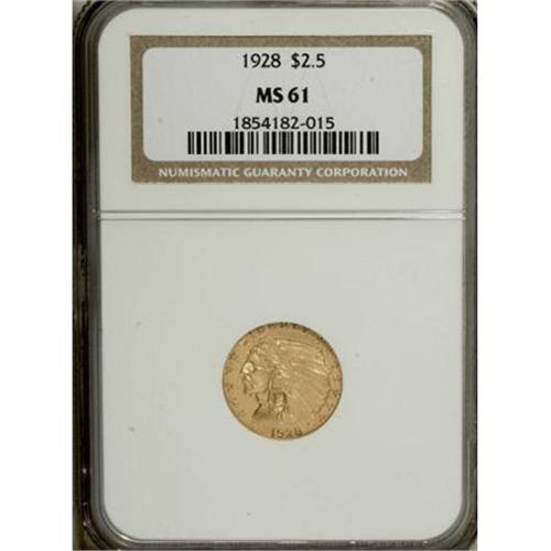 <B>1928 $2 1/2 MS61 NGC.</B></I> NGC Census: (1292/8894). PCGS Population (974/5761). Mintage: 416,000. Numismedia Wsl. Price for NGC/PCGS coin in MS61: $315. (#7952)<BR><BR><b>Shipping:</b> Coins & Currency (<a target="_blank" href="http://www.heritageauctions.com/common/shipping.php">view shipping information</a>)