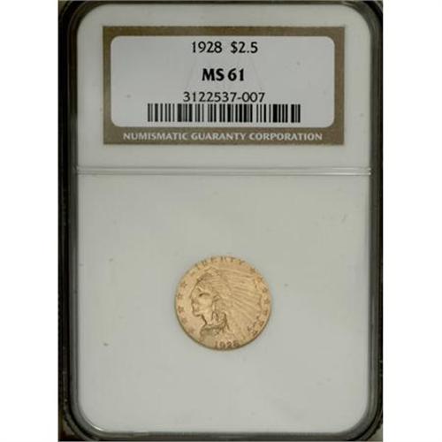 <B>1928 $2 1/2 MS61 NGC.</B></I> NGC Census: (1366/9340). PCGS Population (998/6007). Mintage: 416,000. Numismedia Wsl. Price for NGC/PCGS coin in MS61: $315. (#7952)<BR><BR><B>Coin Engraver:</B> Bela Lyon Pratt<BR><BR><b>Shipping:</b> Coins & Currency (<a target="_blank" href="http://www.heritageauctions.com/common/shipping.php">view shipping information</a>)