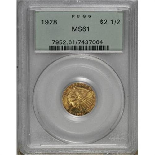 <B>1928 $2 1/2 MS61 PCGS.</B></I> PCGS Population (999/6165). NGC Census: (1402/9595). Mintage: 416,000. Numismedia Wsl. Price for NGC/PCGS coin in MS61: $340. (#7952)<BR><BR><B>Coin Engraver:</B> Bela Lyon Pratt<BR><BR><b>Shipping:</b> Coins & Currency (<a target="_blank" href="http://www.heritageauctions.com/common/shipping.php">view shipping information</a>)
