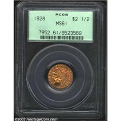 <TABLE cellSpacing=0 cellPadding=0 width="100%" bgColor=#000000 border=0><TBODY><TR><TD width="100%"><TABLE cellSpacing=1 cellPadding=3 width="100%" border=0><TBODY><TR><TD width="100%" bgColor=#79735c><FONT face=arial color=#ffffff size=3><B>Description</B> </FONT></TD></TR><TR><TD width="100%" bgColor=#ffffff><FONT face=arial size=2><B>1928 $2 1/2 MS61 PCGS.</B></I> An orange-gold Quarter Eagle with a bold strike and refreshingly unmarked surfaces. An attractive older holder representative.<BR><I>From the Davis Collection.</B></I> </FONT></TD></TR></TBODY></TABLE></TD></TR></TBODY></TABLE><BR><A name=PricesRealized></A><TABLE cellSpacing=0 cellPadding=0 width="100%" bgColor=#000000 border=0><TBODY><TR><TD width="100%"><TABLE cellSpacing=1 cellPadding=3 width="100%" border=0><TBODY><TR><TD width="100%" bgColor=#79735c><A name=PR><FONT face=arial color=#ffffff size=3><B>Previous Prices from Heritage Auctions</B> </FONT></A></TD></TR><TR><TD bgColor=#f6f6ed><TABLE cellSpacing=0 cellPadding=0 width="100%" border=1><TBODY><TR><TD align=middle width="33%"><B>Date</B></TD><TD align=middle width="33%"><B>Service</B></TD><TD align=middle width="33%"><B>Price</B></TD></TR><TR bgColor=whitesmoke><TD width="33%"><B>09/30/2002</B></TD><TD width="33%">PCGS</TD><TD width="33%">$234.60</TD></TR><TR bgColor=whitesmoke><TD width="33%"><B>07/30/1994</B></TD><TD width="33%">PCGS</TD><TD width="33%">$330.00</TD></TR><TR bgColor=whitesmoke><TD width="33%"><B>08/08/1998</B></TD><TD width="33%">NGC</TD><TD width="33%">$231.00</TD></TR><TR bgColor=whitesmoke><TD width="33%"><B>09/23/1998</B></TD><TD width="33%">NGC</TD><TD width="33%">$220.00</TD></TR><TR bgColor=whitesmoke><TD width="33%"><B>06/20/2000</B></TD><TD width="33%">NGC</TD><TD width="33%">$200.00</TD></TR><TR bgColor=whitesmoke><TD width="33%"><B>03/03/2003</B></TD><TD width="33%">NGC</TD><TD width="33%">$212.75</TD></TR><TR bgColor=whitesmoke><TD width="33%"><B>05/05/2003</B></TD><TD width="33%">NGC</TD><TD width="33%">$241.50</TD></TR><TR bgColor=whitesmoke><TD width="33%"><B>08/06/2003</B></TD><TD width="33%">ANACS</TD><TD width="33%">$299.00</TD></TR><TR bgColor=whitesmoke><TD width="33%"><B>01/04/1996</B></TD><TD width="33%">ANACS</TD><TD width="33%">$187.00</TD></TR><TR bgColor=whitesmoke><TD width="33%"><B>07/08/2003</B></TD><TD width="33%">ANACS</TD><TD width="33%">$243.80</TD></TR></TBODY></TABLE></TD></TR><TR><TD bgColor=#ffffff><FONT face=arial size=1 ?>PLEASE NOTE: All prices realized reflect the final hammer price PLUS the buyer's premium in auctions that charge a buyer's premium. Each item has a notation at the top of the listing indicating whether that lot included a buyer's premium. Example: A item that sells with a final hammer price of $100 and a 20% buyer's premium will display with a price realized of $120. All information listed is intended to be as accurate as possible, but errors are possible. Please use this guide carefully and inform us of any inaccuracies. </FONT></TD></TR></TBODY></TABLE></TD></TR></TBODY></TABLE><BR><TABLE cellSpacing=0 cellPadding=0 width="100%" bgColor=#000000 border=0><TBODY><TR><TD width="100%"><TABLE cellSpacing=1 cellPadding=3 width="100%" border=0><TBODY><TR><TD width="100%" bgColor=#79735c colSpan=6><FONT face=arial color=#ffffff size=3><B>Price Guide*</B> </FONT></TD></TR><TR bgColor=#f6f6ed><TD align=middle><B>Grade</B> </TD><TD align=middle><B>Coin World<BR>(Trends)</B> </TD><TD align=middle><B>Numismedia<BR>Retail</B> </TD><TD align=middle><B>Numismedia<BR>Wholesale</B> </TD><TD align=middle><B>Coin<BR>Universe</B> </TD><TD align=middle><B>Heritage<BR>Value Index</B> </TD></TR><TR bgColor=#ffffff><TD align=middle>60</TD><TD align=right>$250.00</TD><TD align=right>$254.00</TD><TD align=right>$212.00</TD><TD align=right>$250.00</TD><TD align=right>$178.55</TD></TR><TR style="FONT-WEIGHT: bold" bgColor=#cccfdd><TD align=middle>61</TD><TD align=right>---</TD><TD align=right>$305.00</TD><TD align=right>$244.00</TD><TD align=right>---</TD><TD align=right>$260.39</TD></TR><TR bgColor=#ffffff><TD align=middle>62</TD><TD align=right>$405.00</TD><TD align=right>$415.00</TD><TD align=right>$332.00</TD><TD align=right>$360.00</TD><TD align=right>$359.23</TD></TR><TR bgColor=#ffffff><TD colSpan=6><FONT size=1>*All information listed is intended to be as accurate as possible, but errors are possible. No item may be returned or refused based on this information which is provided as a service to our customers. You should contact each pricing source directly to determine the accuracy of this information. </FONT></TD></TR></TBODY></TABLE></TD></TR></TBODY></TABLE><BR><TABLE cellSpacing=0 cellPadding=0 width="100%" bgColor=#000000 border=0><TBODY><TR><TD width="100%"><TABLE cellSpacing=1 cellPadding=3 width="100%" border=0><TBODY><TR><TD width="100%" bgColor=#79735c><FONT face=arial color=#ffffff size=3><B>Population Guide</B> </FONT></TD></TR><TR bgColor=#ffffff><TD align=middle><!-- Begin Output of Population Grid--><TABLE cellSpacing=0 cellPadding=0 width="100%" border=0><TBODY><TR><TD vAlign=center><TABLE cellSpacing=0 width="100%" border=1 cellsadding="3"><TBODY><TR><TD vAlign=center><TABLE cellSpacing=0 cellPadding=3 width="100%" border=1><TBODY><TR><TD vAlign=center align=middle bgColor=#f0f1e8 colSpan=2 <CENTER><FONT face=Arial size=2><B>PCGS Pop </B></FONT><CENTER></CENTER></TD><TD vAlign=center align=middle bgColor=#f0f1e8 colSpan=2><CENTER><FONT face=Arial size=2><B>NGC Pop</B></CENTER></FONT></TD></TR><TR><TD vAlign=center><FONT face=Arial size=2>(61)</FONT> </TD><TD vAlign=center align=right><FONT face=Arial size=2>899</FONT> </TD><TD vAlign=center><FONT face=Arial size=2>(61)</FONT> </TD><TD vAlign=center align=right><FONT face=Arial size=2>738</FONT> </TD></TR><TR><TD vAlign=center><FONT face=Arial size=2>(>61)</FONT> </TD><TD vAlign=center align=right><FONT face=Arial size=2>4480</FONT> </TD><TD vAlign=center><FONT face=Arial size=2>(>61)</FONT> </TD><TD vAlign=center align=right><FONT face=Aria