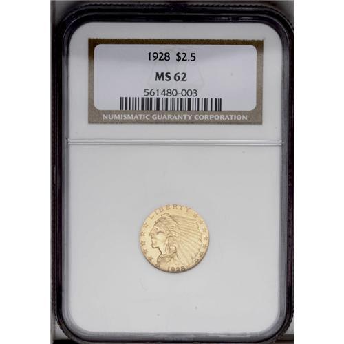 1928 $2 1/2 MS62 NGC. The satiny surfaces are copper-g 1928[$2 1/2] MS62 NGC.