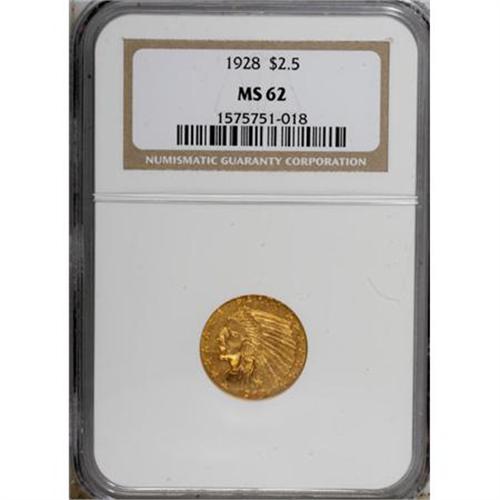 <B>1928 $2 1/2 MS62 NGC.</B></I> NGC Census: (3813/5247). PCGS Population (2381/3494). Mintage: 416,000. Numismedia Wsl. Price for NGC/PCGS coin in MS62: $455. (#7952)<BR><BR><B>Coin Engraver:</B> Bela Lyon Pratt<BR><BR><b>Shipping:</b> Coins & Currency (<a target="_blank" href="http://www.heritageauctions.com/common/shipping.php">view shipping information</a>)
