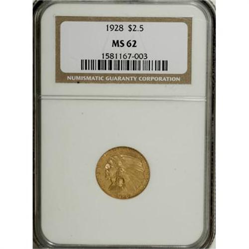 <B>1928 $2 1/2 MS62 NGC.</B></I> NGC Census: (3833/5278). PCGS Population (2398/3543). Mintage: 416,000. Numismedia Wsl. Price for NGC/PCGS coin in MS62: $485. (#7952)<BR><BR><B>Coin Engraver:</B> Bela Lyon Pratt<BR><BR><b>Shipping:</b> Coins & Currency (<a target="_blank" href="http://www.heritageauctions.com/common/shipping.php">view shipping information</a>)