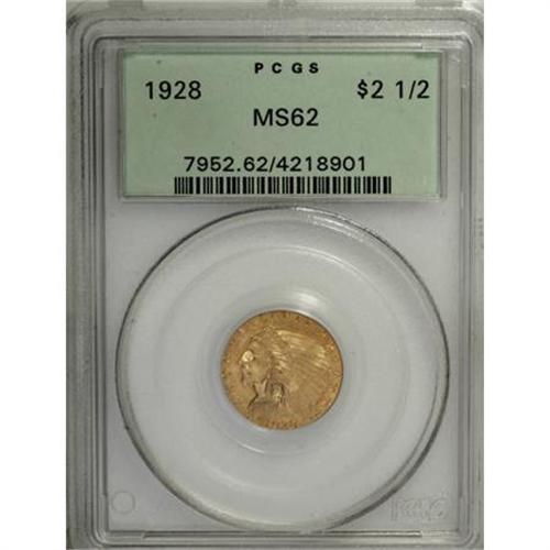 <B>1928 $2 1/2 MS62 PCGS.</B></I> . PCGS Population (2451/3635). NGC Census: (4025/5535). Mintage: 416,000. Numismedia Wsl. Price for NGC/PCGS coin in MS62: $435. (#7952)<BR><BR><B>Coin Engraver:</B> Bela Lyon Pratt<BR><BR><b>Shipping:</b> Coins & Currency (<a target="_blank" href="http://www.heritageauctions.com/common/shipping.php">view shipping information</a>)