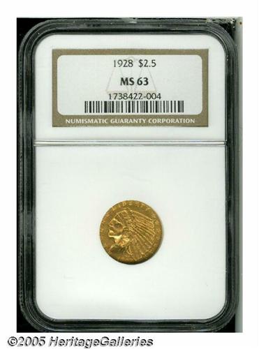 <B>1928<$2 1/2> MS63 NGC.</B></I> Lovely mint-green and red-orange toning covers each side. Typically struck with satin luster and a few minor contact marks.