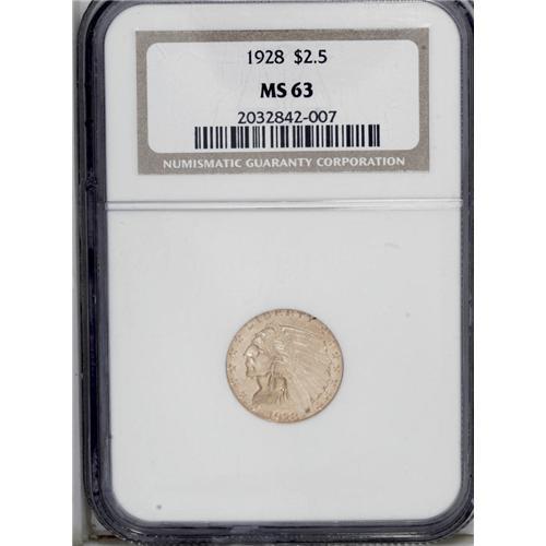 1928 $2 1/2 MS63 NGC. Peach-gold patina occupies each