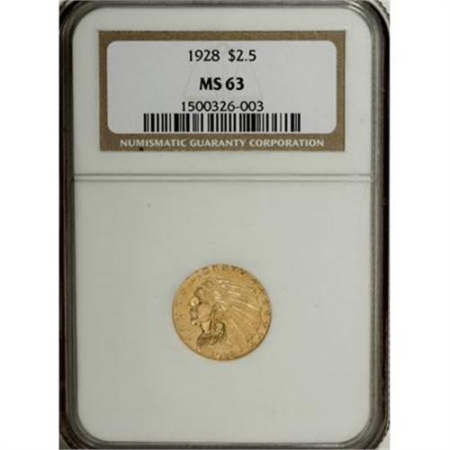 <B>1928 $2 1/2 MS63 NGC.</B></I> NGC Census: (3148/2130). PCGS Population (2128/1372). Mintage: 416,000. Numismedia Wsl. Price for NGC/PCGS coin in MS63: $825. (#7952)<BR><BR><B>Coin Engraver:</B> Bela Lyon Pratt<BR><BR><b>Shipping:</b> Coins & Currency (<a target="_blank" href="http://www.heritageauctions.com/common/shipping.php">view shipping information</a>)