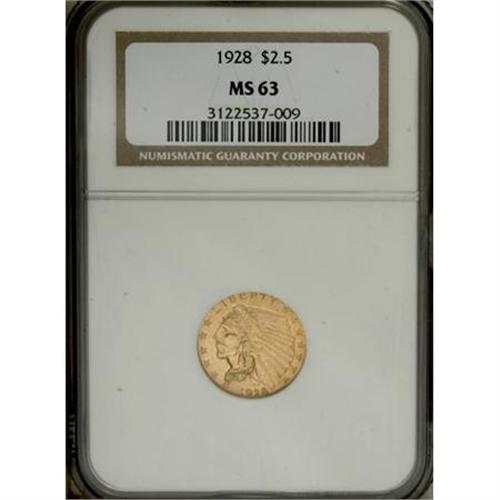 <B>1928 $2 1/2 MS63 NGC.</B></I> NGC Census: (3213/2185). PCGS Population (2155/1432). Mintage: 416,000. Numismedia Wsl. Price for NGC/PCGS coin in MS63: $825. (#7952)<BR><BR><B>Coin Engraver:</B> Bela Lyon Pratt<BR><BR><b>Shipping:</b> Coins & Currency (<a target="_blank" href="http://www.heritageauctions.com/common/shipping.php">view shipping information</a>)