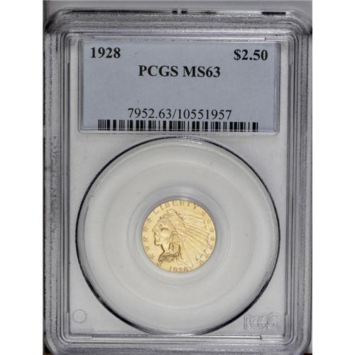 <B>1928<$2 1/2> MS63 PCGS.</B></I> A lustrous example of this date with a contact mark on the Indian's cheek, and another between the E and R in LIBERTY preempting perhaps even a higher grade.