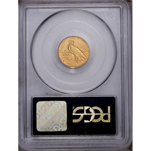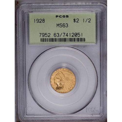 <B>1928<$2 1/2> MS63 PCGS.</B></I> This satiny apricot and lime gold type coin has above average definition on the Indian's headdress. Housed in a green label holder.