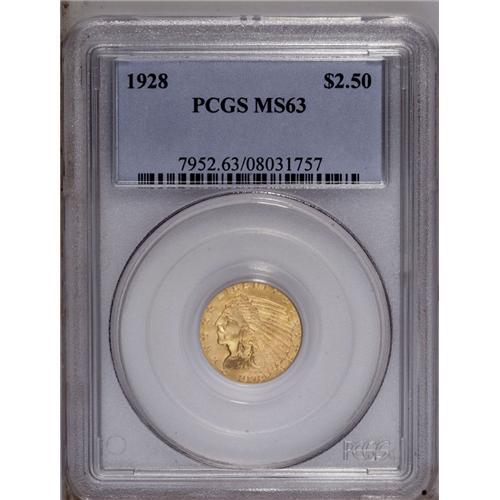 1928 $2 1/2 MS63 PCGS. Well struck, with apricot-gold 1928[$2 1/2] MS63 PCGS.