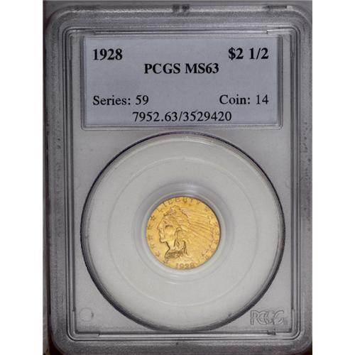 <B>1928 $2 1/2 MS63 PCGS.</B></I> Well struck with rich coloration and gleaming luster. Several pinscratches near the upper obverse rim may have been the result of a failed attempt to remove a small red-orange alloy spot, that resides just below the R in LIBERTY.