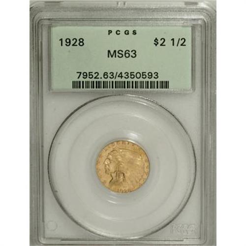 <B>1928 $2 1/2 MS63 PCGS.</B></I> PCGS Population (2119/1364). NGC Census: (3122/2099). Mintage: 416,000. Numismedia Wsl. Price for NGC/PCGS coin in MS63: $740. (#7952)<BR><BR><B>Coin Engraver:</B> Bela Lyon Pratt<BR><BR><b>Shipping:</b> Coins & Currency (<a target="_blank" href="http://www.heritageauctions.com/common/shipping.php">view shipping information</a>\)