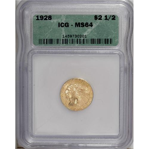 <B>1928 $2 1/2 MS64 ICG.</B></I> A splendid near-Gem example. The highly lustrous yellow-gold fields have only a few stray marks, and the devices are suitably impressed.<BR><BR><b>Shipping:</b> Coin/Currency (<a target="_blank" href="http://www.heritageauctions.com/common/shipping.php">view shipping information</a>)