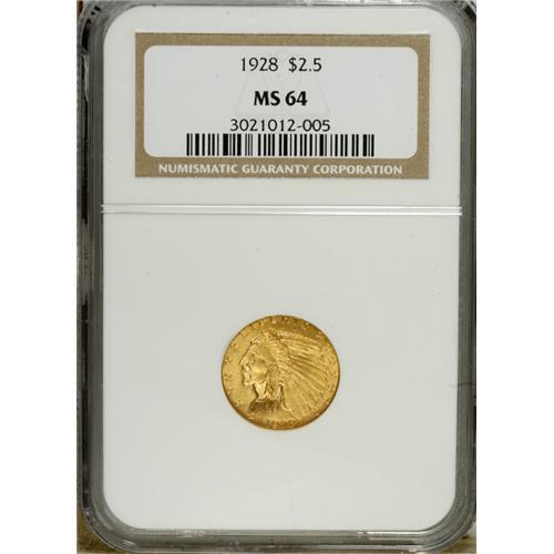 <B>1928 $2 1/2 MS64 NGC.</B></I> Apricot-gold patination is laced with tints of light green. Lustrous surfaces exhibit well struck design elements, and reveal faint handling marks on the raised, exposed fields.<BR><BR><b>Shipping:</b> Coins & Currency (<a target="_blank" href="http://www.heritageauctions.com/common/shipping.php">view shipping information</a>)