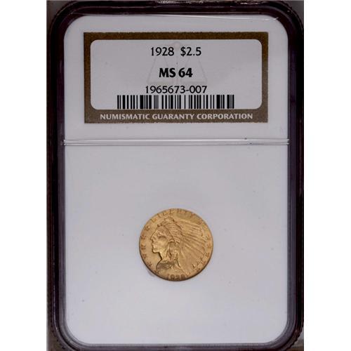 <B>1928<$2 1/2> MS64 NGC.</B></I> Both sides exhibit a honey-gold appearance and somewhat subdued luster. The design elements are sharply impressed, and light handling marks are located in the fields and on the Indian's cheek.