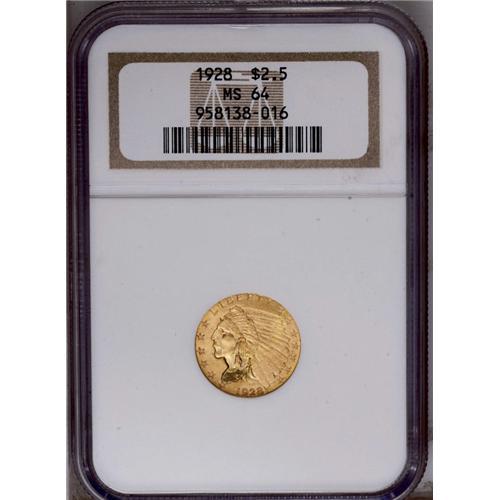 <B>1928<$2 1/2> MS64 NGC.</B></I> Lustrous and well struck with beautiful peach and mint-green toning and a few minor scrapes and blemishes that restrict the grade.