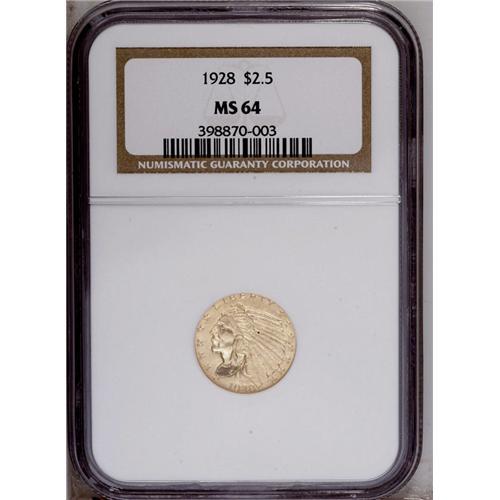 <B>1928 $2 1/2 MS64 NGC.</B></I> Lustrous and well struck with nice yellow-gold patina and normal imperfections for the grade.