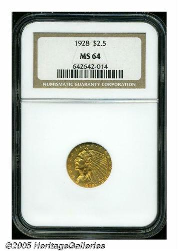 <B>1928<$2 1/2> MS64 NGC.</B></I> Lustrous surfaces display greenish-gold patina and a couple of splashes of orange color, and the design elements are well struck throughout. A couple of minute marks are noted on the Indian's cheek and in the upper reverse field.