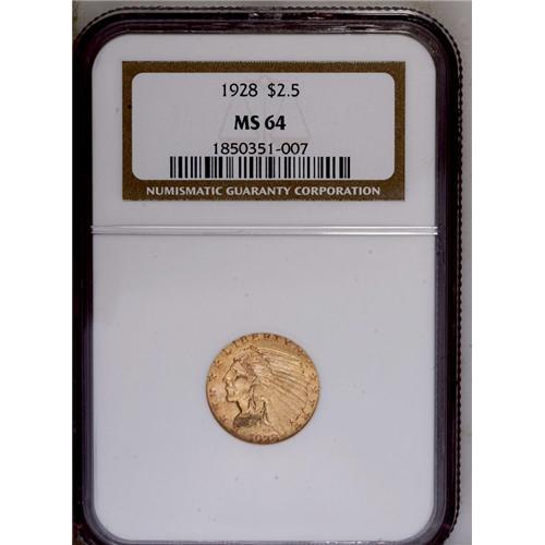1928 $2 1/2 MS64 NGC. The lustrous, apricot-gold surfa 1928