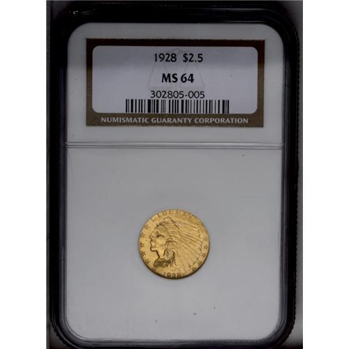 <B>1928<$2 1/2> MS64 NGC.</B></I> This lustrous honey-gold near-Gem features an above average strike, and marks when encountered prove inconsequential.