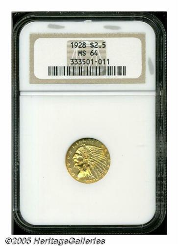 <B>1928<$2 1/2> MS64 NGC.</B></I> This quarter eagle displays bright honey-gold patina and sharply struck motifs, except for a touch of softness on the eagle's left shoulder. A few grade-defining marks are noted in the open, exposed fields.