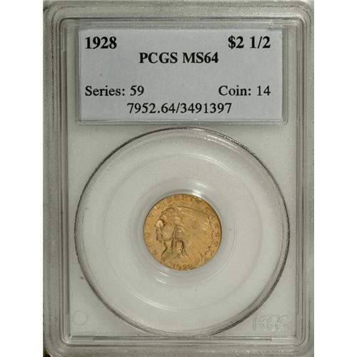 <B>1928 $2 1/2 MS64 PCGS.</B></I> A frosty near-Gem, this piece has pleasing yellow color with faint traces of pinkish overtones. The quarter eagles in the 1920s are all considered common dates in relation to early issues.<BR><BR><b>Shipping:</b> Coins & Currency (<a target="_blank" href="http://www.heritageauctions.com/common/shipping.php">view shipping information</a>)
