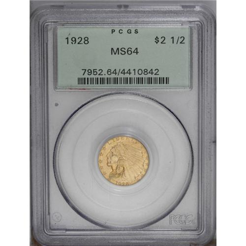 <B>1928 $2 1/2 MS64 PCGS.</B></I> A satiny lemon-gold near-Gem, reasonably struck for the type and void of remotely mentionable marks. Housed in a prior generation holder.
