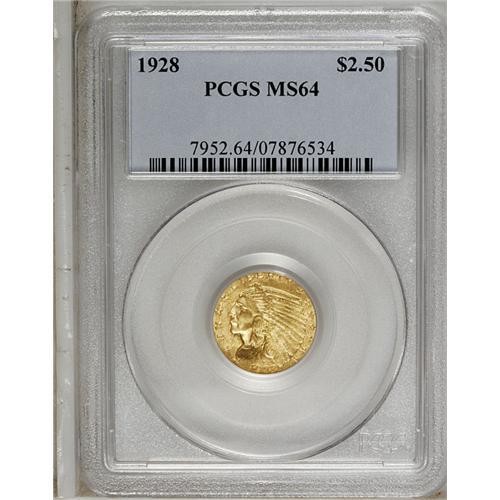 <B>1928<$2 1/2> MS64 PCGS.</B></I> Choice and attractive with highly lustrous orange-gold fields. The sunken-relief devices are boldly defined and few marks appear on either side.
