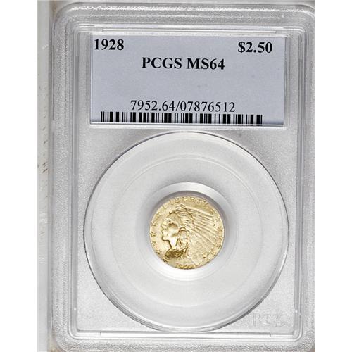 <B>1928<$2 1/2> MS64 PCGS.</B></I> Choice and solidly struck for this issue with adequate luster. The yellow-gold surfaces have some small abrasions, particularly beneath the chin.