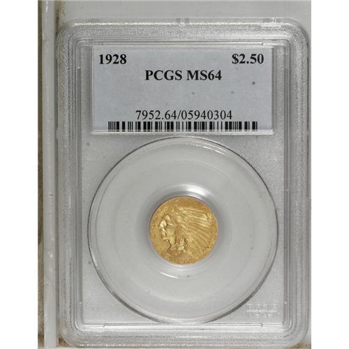 <B>1928 $2 1/2 MS64 PCGS.</B></I> Wisps of light tan visit the lustrous peach-gold surfaces of this attractive near-Gem. Sharply struck throughout, with just a few grade-defining marks.<BR><BR><b>Shipping:</b> Coins & Currency (<a target="_blank" href="http://www.heritageauctions.com/common/shipping.php">view shipping information</a>)