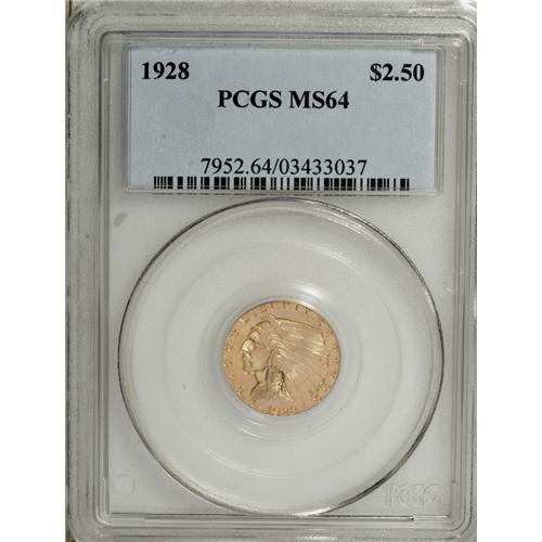 <B>1928 $2 1/2 MS64 PCGS.</B></I> Yellow-gold with forest-green accents on the obverse and strong yellow-orange zones on the reverse. Well struck with soft, pleasing luster.<BR><BR><b>Shipping:</b> Coin/Currency (<a target="_blank" href="http://www.heritageauctions.com/common/shipping.php">view shipping information</a>)