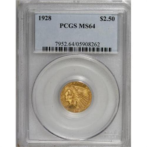 <B>1928 $2 1/2 MS64 PCGS.</B></I> An uncommonly lustrous green-gold example of the penultimate quarter eagle issue, pleasingly detailed with few marks on either side. The overall visual appeal is strong, and the coin is an excellent candidate for a similarly graded type set.<BR><BR><B>Coin Engraver:</B> Bela Lyon Pratt<BR><BR><b>Shipping:</b> Coins & Currency (<a target="_blank" href="http://www.heritageauctions.com/common/shipping.php">view shipping information</a>)