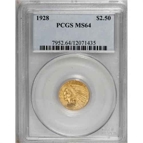 <B>1928 $2 1/2 MS64 PCGS.</B></I> A highly lustrous and distinctly appealing near-Gem example of this later Indian quarter eagle issue, pleasingly detailed overall with few marks. The sun-gold surfaces show a touch of orange at the upper obverse.<BR><BR><B>Coin Engraver:</B> Bela Lyon Pratt<BR><BR><b>Shipping:</b> Coins & Currency (<a target="_blank" href="http://www.heritageauctions.com/common/shipping.php">view shipping information</a>)