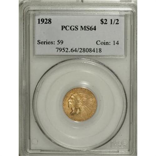 <B>1928 $2 1/2 MS64 PCGS.</B></I> Lustrous and nicely preserved, this near-Gem displays variegated peach and mint-green toning over satiny surfaces. The motifs are boldly reproduced, and only minuscule marks are detected on either side. A worthy example of the penultimate issue in the Indian Head quarter eagle series. <BR><BR><B>Coin Engraver:</B> Bela Lyon Pratt<BR><BR><b>Shipping:</b> Coins & Currency (<a target="_blank" href="http://www.heritageauctions.com/common/shipping.php">view shipping information</a>)