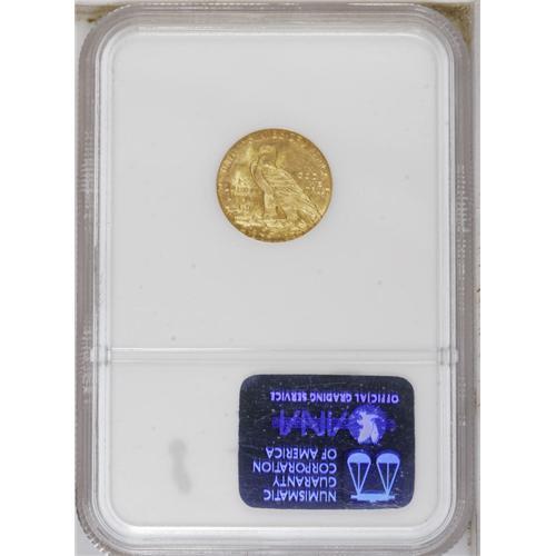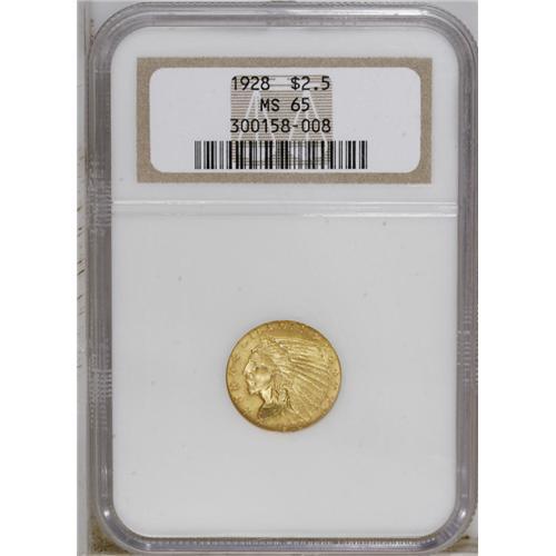 <B>1928 $2 1/2 MS65 NGC.</B></I> A satiny khaki-gold type coin with few noticeable marks. The lower portion of the headdress has reasonable detail, and the remainder of the designs are well struck. By the 1920s, quarter eagles were no longer in circulation, and the easiest method for obtaining an example was to tip a bank teller.<BR><BR><b>Shipping:</b> Coin/Currency (<a target="_blank" href="http://www.heritageauctions.com/common/shipping.php">view shipping information</a>)