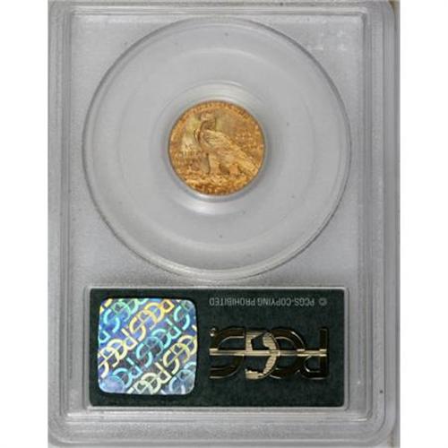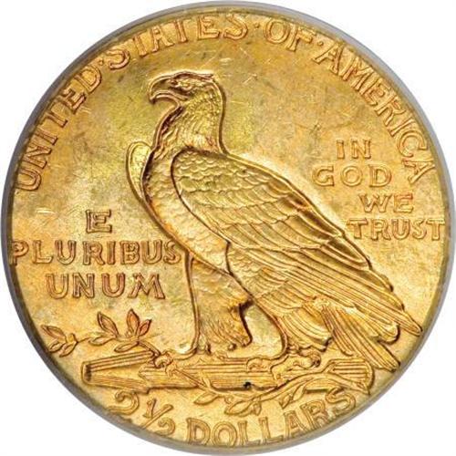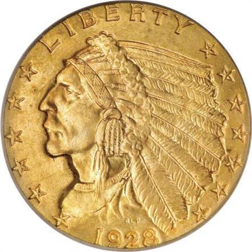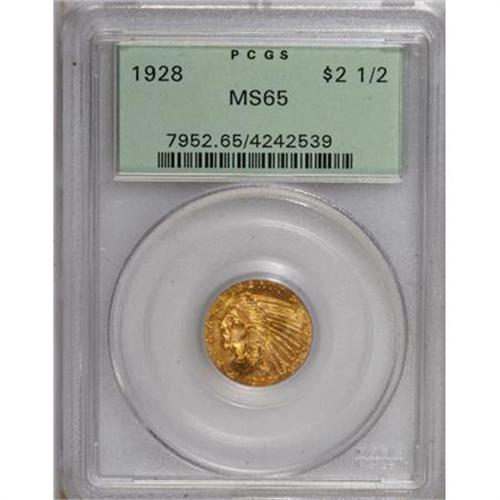 <B>1928 $2 1/2 MS65 PCGS.</B></I> Original orange toning adorns this lustrous gold type coin. The central reverse exhibits olive-green shades. The obverse is well preserved, and the reverse is smooth save for a few unimportant field grazes. A suitable strike with only minor blending of detail on the lowest headdress feathers. In a green label holder.<BR><BR><B>Coin Engraver:</B> Bela Lyon Pratt<BR><BR><b>Shipping:</b> Coins & Currency (<a target="_blank" href="http://www.heritageauctions.com/common/shipping.php">view shipping information</a>)