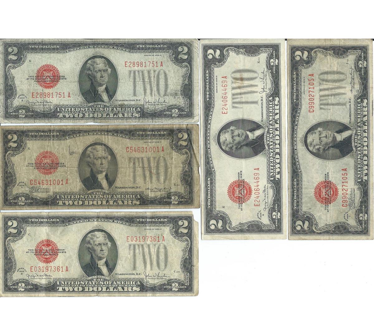 1928 $2 Currency Lot of 5.