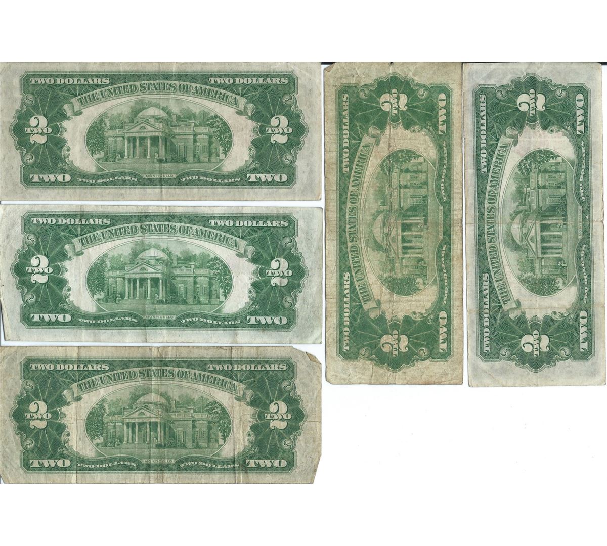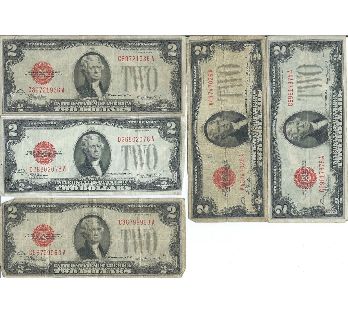 1928 $2 Currency Lot of 5.