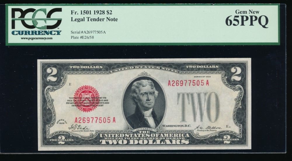 One 1928 $2 Legal Tender Note PCGS 65PPQ.