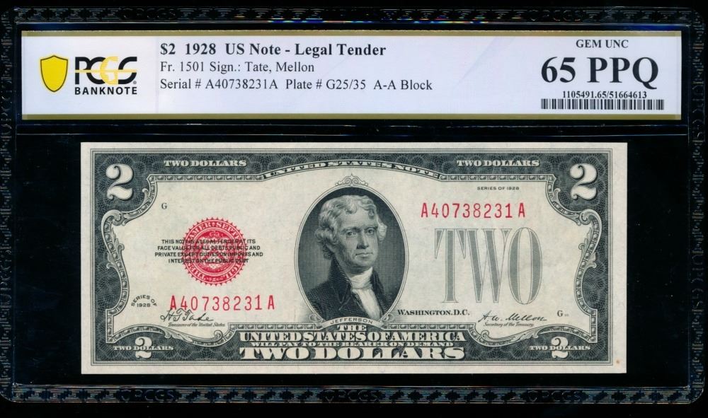 One 1928 $2 Legal Tender Note PCGS 65PPQ.