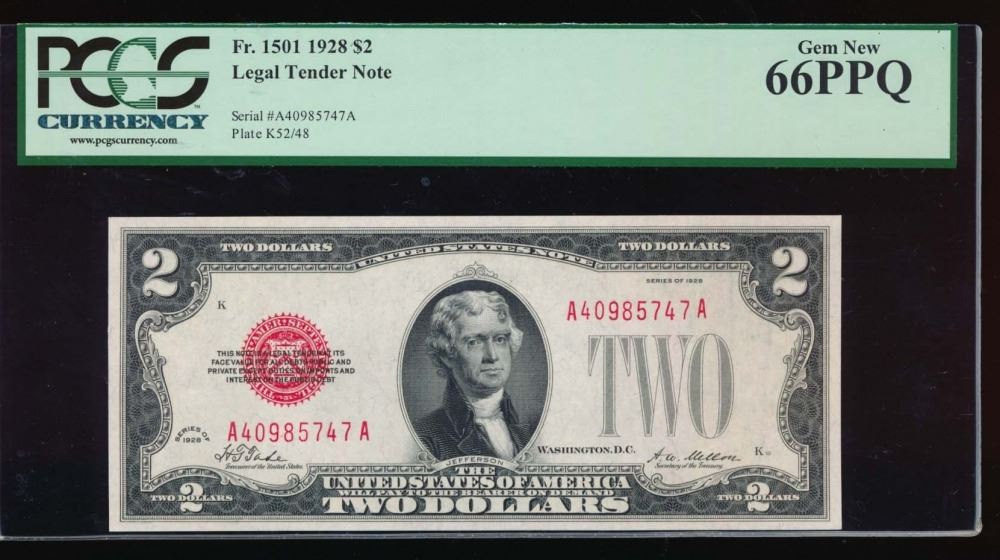 One 1928 $2 Legal Tender Note PCGS 66PPQ.